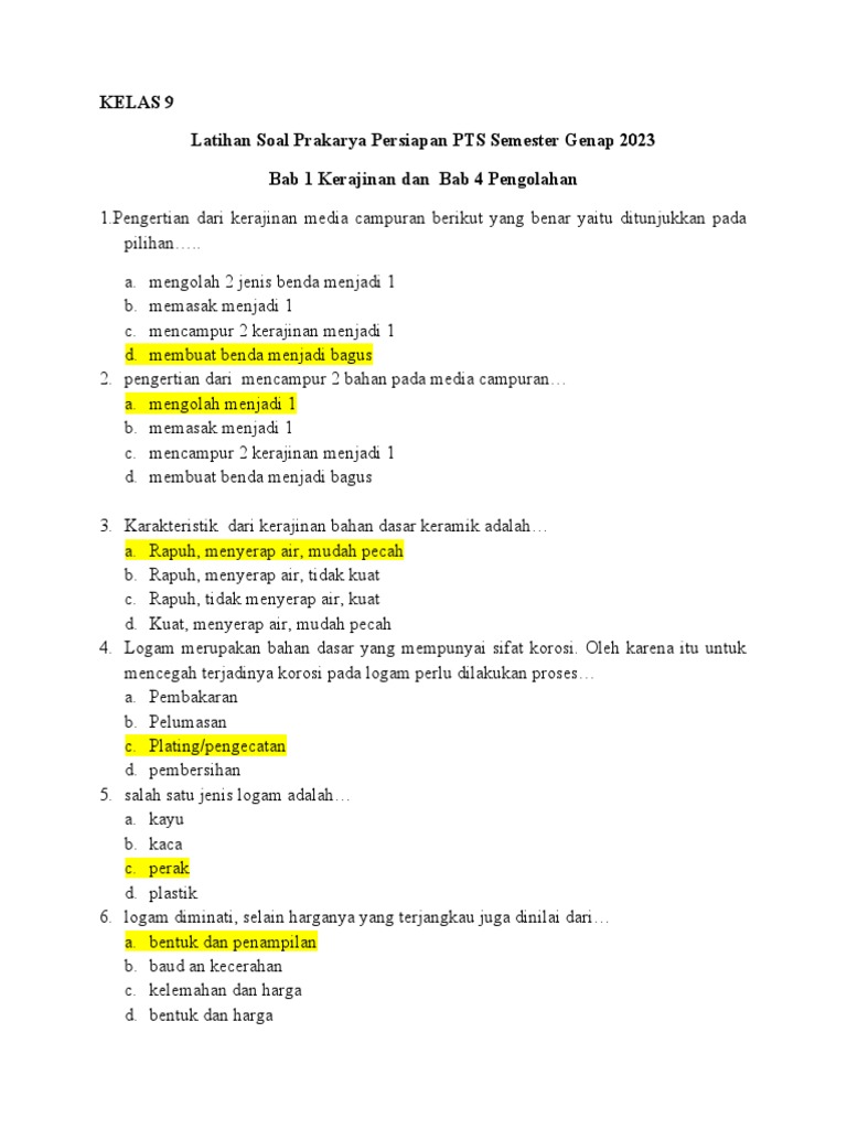 Prakarya, sebagai salah satu mata pelajaran inti dalam kurikulum pendidikan di Indonesia, memegang peranan krusial dalam mengembangkan keterampilan praktis, kreativitas, dan pemahaman kewirausahaan siswa. Berbeda dengan mata pelajaran teoritis lainnya, Prakarya menuntut siswa untuk tidak hanya memahami konsep, tetapi juga mampu mengaplikasikannya dalam bentuk produk nyata atau solusi inovatif. Oleh karena itu, soal ujian Prakarya, khususnya di kelas 9 semester 1, memiliki karakteristik unik yang mengukur tidak hanya pengetahuan kognitif tetapi juga kemampuan afektif dan psikomotorik.
